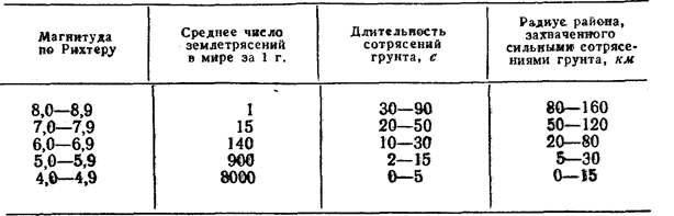 Землетрясения—это сильные колебания земной коры, вызываемые тектоническими или вулканическими причинами и приводящие к разрушению зданий, сооружений, пожарам и человеческим жертвам. Основными характеристиками землетрясений являются: глубина очага, магнитуда и интенсивность энергии на поверхности земли. Глубина очага землетрясения обычно находится в пределах от 10 до 30 км, в ряде случаев она может быть значительно больше. Магнитуда характеризует общую энергию землетрясения и представляет собой логарифм максимальной амплитуды смещения почвы в микронах, измеренной по сейсмограмме на расстоянии 100 км от эпицентра. Магнитуда (М) по Рихтеру изменяется от 0 до 9 (самое сильное землетрясение). Увеличение ее на единицу означает десятикратное возрастание амплитуды колебаний в почве (или смещение грунта) и увеличение энергии землетрясения в 30 раз. Так, амплитуда смещения почвы землетрясения с М=7 в 100 раз больше, чем с М=5, при этом общая энергия землетрясения увеличивается в 900 раз. Интенсивность энергии на поверхности земли измеряется в баллах. Она зависит от глубины очага, магнитуды, расстояния от эпицентра, геологического строения грунтов и других факторов. Для измерения интенсивности энергии землетрясений в нашей стране принята 12-балльная шкала Рихтера.
