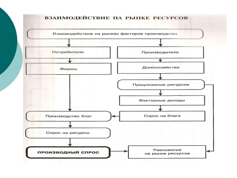 Особенности функционирования рынка ресурсов: ¡ На рынке ресурсов фирмы выступают в качестве покупателей, а домохозяйства – в роли продавцов. ¡ Спрос фирм на факторы производства носит производный (вторичный) характер, т. е. зависит от спроса на готовые товары. ¡ На рынке ресурсов фирма закупает необходимые ей факторы производства и комбинирует их определенным образом с целью получения наибольшей отдачи от вложений.