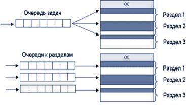 Рис.10 Основные способы распределения памяти фиксированными разделами. Распределение памяти динамическими разделами При использовании данного метода память в начальный момент времени считается свободной (за исключением памяти отведенной под ОС). Каждому процессу отводится вся необходимая память. Если ее не хватает, то процесс не создается. В произвольный момент времени память представляет собой случайную последовательность занятых и свободных участков. Функции ОС: