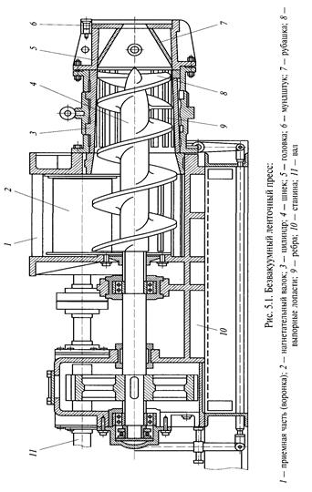 Несмотря на все многообразие керамических изделий и применяемого для их изготовления сырья важнейшие процессы при их производстве, различаясь в деталях, по существу одни и те же. Получение керамических изделий состоит в основном из следующих технологических операций: 1) подготовка сырой керамической массы; 2) формование изделий; 3) сушка изделий и отделка их в необожженном виде; 4) обжиг изделий; 5) глазурование изделий (может предшествовать обжигу или выполняться после предварительного обжига с последующим обжигом для закрепления глазури). Приготовление керамической массы. В общем случае керамическая масса состоит из четырех компонентов: глины (или смеси глин); отощителя; флюса и воды. В некоторых случаях, при подходящих природных глинах, отсутствует необходимость в использовании отощителя или флюса. При необходимости получения пористого черепка в массу вводят порообразующие материалы. Для того чтобы точно дозировать и равномерно смешивать с другими компонентами, глину подвергают сначала грубому, а затем тонкому измельчению. Необходимым условием нормальной работы агрегатов тонкого помола является невысокая влажность глины (не выше 7... 10 %). Поэтому излишне влажную глину сушат в сушильных барабанах сразу после грубого измельчения дробилками или глинорезками. При другом способе производится помол всех компонентов в шаровых мельницах мокрого помола. Полученную керамическую суспензию пропускают через вибрационное сито и подвергают распылительной сушке, получая пресс-порошок влажностью 5...7%. Для производства доброкачественных изделий необходимо придать глине высокую однородность, для чего ее перемешивают в глиномешалках, при необходимости доувлажняя и иногда разогревая для повышения пластичности. Выбор схемы подготовки керамической массы осуществляется с учетом как особенностей сырьевых материалов, так и способа последующего формования, для которого главным моментом является влажность W сырьевой смеси. Существуют три наиболее часто применяемых способа подготовки керамической массы: полусухой (W = 7... 12%), пластический (W = 17...22%) и мокрый (W> 30%). Формование керамических изделий. Формование керамических изделий осуществляют пластическим способом, полусухим прессованием и шликерным литьем. Пластическое формование (W- 17...22%) осуществляют при помощи шнекового (ленточного) пресса. Современный безвакуумный ленточный пресс — сложный агрегат, однако принцип его работы чрезвычайно прост (рис. 5.1). Керамическая масса через воронку / и нагнетательные валки 2 подается на лопасти шнека (червяка) 4, который, вращаясь вокруг своей оси, захватывает массу и перемещает ее в сторону сужающейся части — головки 5. На выходе из головки устанавливается съемная насадка — мундштук 6, отверстие в котором имеет ту или иную форму, зависящую от конкретного изделия. При изготовлении кирпича мундштук имеет прямоугольное отверстие размером 250x120 мм. Под действием давления (1,6...7,0 МПа), развиваемого шнеком, масса выдавливается через отверстие мундштука и выходит в виде непрерывной глиняной ленты, которая разрезается на отдельные кирпичи стальными струнами. Методом пластического формования изготавливают как полнотелый, так и пустотный (многодырчатый) кирпич, трубы, черепицу и другие изделия. При производстве керамических труб используют вертикальн