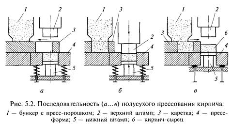 Полусухое прессование производится при высоком давлении (25...35 МПа). В этом случае оптимальное содержание влаги в рабочей массе должно составлять 7... 12%. Формование осуществляется на механических и гидравлических прессах.. Прессование производится в пресс-форме, куда из бункера с помощью каретки переносится порция пресс-порошка. Одновременно при движении вправо каретка сталкивает отформованный сырец на приемное устройство. При обратном движении каретки (влево) нижний штамп опускается и пресс-порошок заполняет пресс-форму. После этого опускается и входит в пресс-форму верхний штамп, производя предварительное уплотнение массы при давлении около 2 МПа, в результате чего ее объем уменьшается на 30... 35 %. Дальнейшее прессование производится нижним штампом в две ступени. На первой ступени создается давление около 9 МПа. После этого нижний штамп опускается вниз, давая выход отжатому из прессуемой массы воздуху. Если этого не делать, то воздух, расширяясь после снятия давления, разрыхлит отформованное изделие. Окончательное прессование производится при давлении около 30 МПа. Полусухим прессованием получают керамические плитки, кирпич, черепицу. Этот способ формования имеет преимущество перед пластическим — при нем практически не требуется сушки изделий и они могут сразу направляться на обжиг.