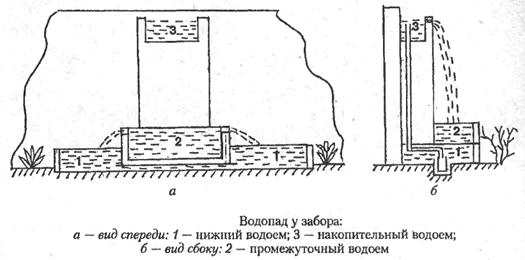 Второй вариант предусматривает экономное использование пустующего места у забора или глухой стены. Наиболее простым вариантом строительства этого водопада является использование кирпича с облицовкой плоским природным камнем. При этом обязательно облицовывают камнем и часть забора или стены. С декоративной точки зрения очень удачно заменить плоский природный камень морской галькой или плоскими валунами. При строительстве для повышения гидроизолирующих свойств цементного раствора используются специальные минеральные добавки. Как показано на рисунке, водопад состоит из четырех водоемов, расположенных в трех плоскостях. Два нижних водоема соединены между собой трубой, что позволяет поддерживать в них одинаковый уровень воды и использовать один насос. Водоем, в котором размешается насос, оборудован приямком. Промежуточный водоем размещен выше нижних на 30—40 см. Такой перепад уровней дает возможность получения красивых водяных потоков, падающих из него. При этом при помощи уровня выверяется одинаковый уровень и высота водяных порожков. В противном случае нарушится синхронность водяных потоков. Стенки промежуточного водоема должны быть выше уровня воды на 15—20 см для недопущения ее разбрызгивания.