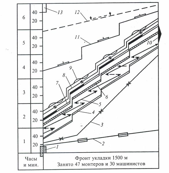 Рисунок 17.2 График основных работ капитального ремонта пути Вслед за снятием напряжения, заземлением контактной сети и отсоединением заземления опор от рельсовой нити электробалластер с локомотивом в голове (первый рабочий поезд) отрывает рельсошпальную решетку 2 от балластной призмы с одновременным продавливанием балласта между шпал. За электробалластером 14 монтеров пути и 1 машинист электрогаечными ключами разболчивают 3 стыки, оставляя накладки на рельсах с одним болтом. После подготовки фронта для путеразборочного поезда разболчивание стыков продолжают 4 монтера и 1 машинист. По мере готовности фронта работ путеразборочный кран УК-25/9-18 демонтирует 4 рельсошпальную решетку звеньями, формируя их в пакеты, с последующим перемещением и закреплением на платформах (второй рабочий поезд). На освобожденной призме автогрейдер срезает 5 балласт шпальных ящиков, а машина ВМС очищает 6 подшпальный слой балласта, перемещая его планировщиком в валы по обе стороны. В последующем от использования машины ВМС отказались. На очищенном слое призмы путеукладочный кран УК-25/9-18 монтирует 7 рельсошпальную решетку новыми звеньями, доставленными с производственной базы (третий рабочий поезд). За краном 6 монтеров и 1 машинист сболчивают 8 стыки, 10 монтеров поправляют шпалы по меткам и рихтуют 9 путь, 11 монтеров и 1 машинист заготавливают рельсовые рубки и укладывают 10 их на отводе. Выправка 11 уложенного пути производится машиной ВПО-3000, оборудованной рихтовочным устройством (четвертый рабочий поезд). Для подбивки пути используется балласт из боковых валов. В местах зарядки, разрядки и препятствий для работы ВПО и отступлений по уровню выправку пути 12 производит ВПР-02. Завершают работы в «окно» 4 монтера пути укладкой 13 временного переездного настила. После открытия перегона разрешается движение первых одного-двух поездов со скоростью 25 км/ч и последующих - не менее 60 км/ч. Четвертый этап охватывает пять «окон», из них два по 6 ч с фронтом работ по 360 м, два по 5 часов с фронтом по 280 м и одно 6 - часовое совмещенное «окно» с фронтом работ 220 м. Графики производства работ на этом этапе представлены на рисунке 17.1