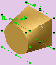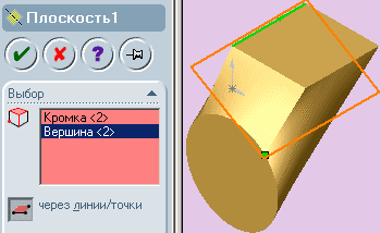 Первый способ создания новой плоскости - "через линии/точки". На рисунке виден результат работы этого метода. Мы выбрали верхнюю левую кромку квадрата и точку на окружности. На рисунке они показаны зеленым цветом.