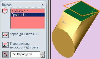 Третий способ - плоскость под заданным углом к плоскости и проходящая через заданную прямую. На рисунке снова выбрана верхняя плоскость модели и самая дальняя от нас сторона квадрата. Заданый угол: 15 градусов.