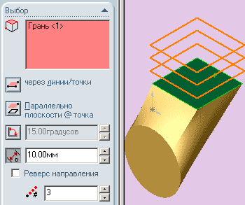Четвертый способ - плоскость, параллельная заданной и на заданном расстоянии от нее. Имеется возможность реверса направления а также создания нескольких плоскостей на одинаковом расстоянии друг от друга и "материнской" плоскости. Мы задали 3 плоскости на расстоянии 10 мм каждая.