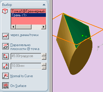 Пятый способ - плоскость, перпендикулярная кривой и проходящая через заданную точку. Под кривой можно понимать любое, в том числе и прямое ребро. Под точкой - любую вершину или точку эскиза. Для создания точек можно также использовать команду "Вставка -> Трехмерный эскиз" + инструмент "точка". На рисунке выбраны вырхняя дуга окружности и точка, на ее конце. На самом деле точка вовсе не должна лежать на кривой. Можно было выбрать точку вершины квадрата. В этом случае параметр "Исходная точка на кривой", будучи включенным, разместит исходную точку в месте пересечения полученной плоскости и кривой. Иначе - исходная точка будет располагаться в точке вершины квадрата.