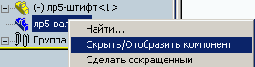 "Скрыть/отобразить компонет" (в переводе справки - погашеный компонет) полезен если вы работаете со сложной сборкой и вам необходимо временно выключить отображение какой-либо детали, входящей в сборку. Встаньте на название этой детали в дереве конструирования и нажмите на этот инструмент, изображение детали пропадет с экрана, а ее название и условное изображение в дереве станет светло-серого цвета. Чтобы включить ее отображение, надо встать на название и повторно нажать на инструмент "Скрыть/отобразить компонет" или воспользоваться пунктом всплывающего меню "Скрыть/отобразить компонет" по щелчку правой кнопки мыши. Надо учитывать следующее: погашенный компонет не загружается в память и более не является функциональной частью сборки. Погашенный компонент невидим и выбирать его элементы нельзя. Он удаляется из памяти, поэтому скорость перестроения и отображения повышается. Однако сопряжения, в которых используются погашенные компоненты, также погашаются. В результате положение компонентов сборки становится недоопределенным. Это также может повлиять на элементы в контексте, содержащие ссылки на погашенные компоненты. При возврате погашенного компонента в полностью решенное состояние могут возникнуть конфликты. Поэтому состояние погашения при моделировании следует использовать очень осторожно.