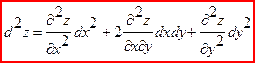 Дифференциалы высших порядков Дана функция z=f(x,y), дифференцируемая в точке х. Было ранее установлено, что dz=fx’(x,y)dx+fy’(x,y)dy,где х и у независимые переменные. Зафиксируем dx и dy. Опр. Дифференциалом второго порядка называется дифференциал от дифференциала первого порядка и обозначается: d2 z=d(dz)=d(fx(x,y)dx+fy(x,y)dy)=d(fx’(x,y)dx)+d(fy’(x,y)dy)= =d(fx’(x,y))dx+d(fy’(x,y))dy=((fxx’’(x,y))dx+(fxy’’(x,y))dy)dx+(f(yx’’(x,y)dx+fyy’’(x,y)dy)dy=fxx’’(x,y)dx2+2fxy’’(x,y)dxdy+fyy’’(x,y)dy2 d2z=fxx’’(x,y)dx2+2fxy’’(x,y)dxdy+fyy’’(x,y)dy2