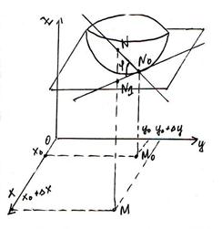 Опр. Касательной плоскостью поверхности z=f(x,y) d в точке No, называется плоскость, для которой угол между этой плоскостью и секущей NoN стремится к нулю при стремлении точки N к No по поверхности.