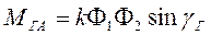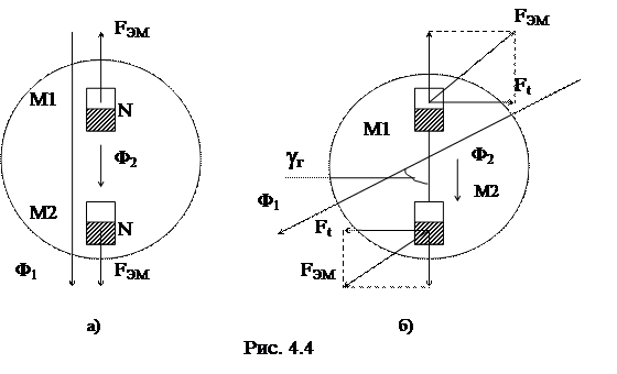 Для выяснения природы гистерезисного момента рассмотрим физические процессы, происходящие в роторе при асинхронном вращении, т.е. когда материал ротора непрерывно перемагничивается. В момент времени, когда вектор вращающегося потока Ф1 статора занимает положение А (рис.4.4, а) элементарные магнитики М1 и М2 ротора ориентируются вдоль этого потока. Силы взаимодействия FЭМ магнитиков М1, М2, создающих поток Ф2, направлены вдоль потока Ф1 и вращающего момента не создают. При перемещении потока статора в положение Б в том же направлении будут поворачиваться и элементарные магнитики (рис. 4.4, б). Однако вследствие явления гистерезисного запаздывания магнитики М1 и М2 не сразу повернутся на тот же угол, что и поток Ф1, и между потоками Ф1 и Ф2 образуется угол гистерезисного запаздывания gГ. Вследствие этого наряду с радиальными появятся тангенциальные составляющие Ft, которые и создают гистерезисный момент МГА асинхронного режима