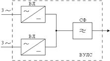 В аварийном режиме тиристор подключает АБ к нагрузке. Послеаварийный заряд АБ осуществляется при ее отключении от нагрузки, поэтому не требуется регулировать Пределы изменения Рассмотрим систему on-line (с нагруженным ВДК), которая обеспечивает лучшее качество электроэнергии по сравнению с off-line (рис. 3.4.10).
