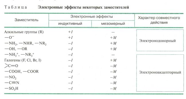 Многие заместители обладают одновременно и индуктивным, и мезомерным эффектами (см. таблицу). У всех заместителей за исключением галогенов мезомерный эффект по абсолютной величине значительно превосходит индуктивный.
