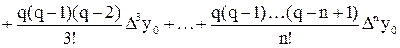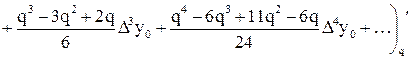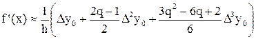 для x Î (x0 – d; x3 + d), и т. д. (при некоторых δ > 0, определяющих промежуток экстраполяции приемлемого качества соответствующей интерполяционной формулой). Для дальнейшего особый интерес представляют частные случаи формул (3)-(5), связывающие приближенное значение производной функции f(x) в узлах x0, x1, … с узловыми значениями самой функции. Учитывая, что точкам x0, x1, x2, x3 соответствуют значения q = 0, 1, 2, 3, и раскрывая конечные разности через значения yi (i = 0, 1, 2, 3), имеем: при n = 1 из (3)