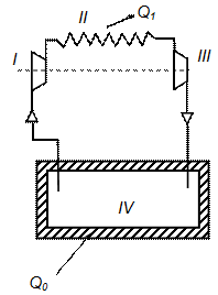 Холодильная машина, реализующая цикл Джоуля, состоит из компрессора I, промежуточного холодильника II, детандера III и рефрижератора IV. Рабочее тело (например, воздух) адиабатно сжимается (1, 2) в компрессоре и проталкивается в промежуточный холодильник II, где от него отводится теплота Q 1 в изобарном процессе 2, 3 (температура точки 3 близка к температуре окружающей среды). Дальше воздух поступает в детандер III, где происходит его адиабатическое расширение 3, 4 до первоначального давления Р 0 с одновременным совершением полезной работы расширения. В состоянии 4 температура воздуха – низшая в цикле и, поскольку она меньше температуры Т 0 с , то такой воздух является источником холода (охлаждающим телом). Направляя его в рефрижератор, можно охлаждать, например, пищевые продукты, т.е. получать охлаждающий эффект (холодопроизводительность Q 0). Температура воздуха при этом будет повышаться по изобаре 4, 1. Затем воздух отводится из рефрижератора в компрессор и цикл повторяется. Работа цикла l = q 1 – q 0 будет эквивалентна площади цикла 1, 2, 3, 4. Благодаря тому, что процессы подвода и отвода тепла в цикле воздушной холодильной машины протекают при постоянном давлении, указанные количества тепла могут быть вычислены как разность энтальпий q 0 = і 1 – i 4, q 1 = і 2 – i 3, а работа цикла l = (і 2 – i 3) – (і 1 – i 4). Преобразуя последнее выражение, можно получить l = (і 2 – i 1) – (і 3 – i 4), т.е. что работа цикла равна разности работ сжатия в компрессоре (і 2 – i 1) и расширения в детандере (і 3 – i 4). Знак минус говорит о том, что, если в компрессоре необходимо затратить работу на сжатие воздуха, то в детандере можно вернуть часть затраченной работы. С этой целью в реальных воздушных холодильных машинах турбокомпрессор помещают на одном валу с турбодетандером, чтобы полезная работа последнего шла на привод турбокомпрессора и частично компенсировала энергозатраты (рис. 3.1). Холодильный коэффициент теоретического цикла воздушной холодильной машины с учетом этого будет