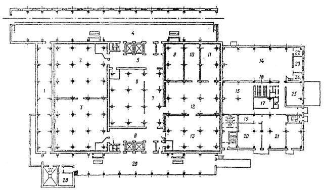 Рис. 9.1. План первого этажа типового распределительного холодильника емкостью 1 – соединительный коридор; 2,3 – камеры универсальные; 4 – железнодорожная платформа (дебаркадер); 5, 8 – вестибюли; 6 – экспедиция; 7 – коридор; 9, 10, 11 – морозильные камеры; 12 – загрузочно-разгрузочное помещение; 13 – камера хранения охлажденного мяса; 14 – машинное отделение; 15 – материальный склад; 16 – мужской гардероб; 17 – тепловой пункт; 18 – кладовая; 19 – электролитная; 20 – зарядная; 21 – профилакторий и стоянка электропогрузчиков; 22 – лаборатория; 23 – центральный пункт управления и контроля; 24 – комната механика; 25 – механическая мастерская; 26 – автомобильная платформа; 27 – мойка; 28 – комната кладовщиков.