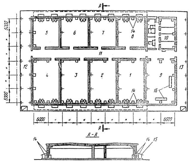 Рис. 9.2. Холодильник для фруктов и винограда емкостью 1200 т с децентрализованной системой охлаждения: 1...4 – камеры хранения фруктов; 5...8 – камеры хранения винограда; 9 – экспедиция; 10 – блок подсобных, бытовых и конторских помещений; 11 – грузовой коридор; 12 – железнодорожная платформа; 13 – автомобильная платформа; 14 – холодильно-нагревательная машина ХМФ-16; 15 – навес; 16 – инспекционный транспортер ТСИ