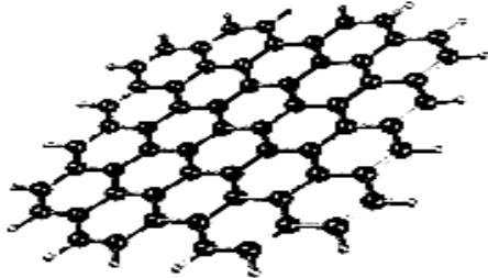Рисунок 1.12 Плоский «лист» графена, стабилизированный во- дородом (C62H20). Уже на протяжен ии многих лет высказывались предпо- ложения о присутствии графенов и графеноподобных объек- тов в природных нефтях и битумах. Прямое наблюдение структур, похожих на графены, описано в публикации, по- священной исследованию фуллеренов среди асфальтенов нефти (Camacho-Bragado et al., 2002). На изображениях, по- лученных в просвечивающем электронном микроскопе, при- сутствовали искривленные «листки», отделившиеся от разру- шенных многослойных «луковиц» фуллеренов. В другом ис- следовании нефтяных асфальтенов приведены изображения графеноподобных «листков» входящих в молекулярные агре- гаты диаметром, примерно, 50 нм (Perez-Hernandez et al., 2003). Косвенные подтверждения наличия графеновых «па- чек» в 3-5 нм агрегатах асфальтенов были получены метода- ми малоуглового рассеяния рентгеновских лучей и синхро- тронного излучения (Chianelli et al., 2007).