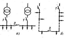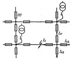 где Ik – ток к.з. в поврежденной линии; Ik,iнаиб – наибольший из токов КЗ других линий рассматриваемого узла. При этом ∑ Ik,i = Ik. Чем больше линий присоединяется к одному узлу, тем лучше обеспечивается избирательность защиты сетей. При четырех линиях (рисунок 6.11) обеспечение избирательности обычно не вызывает затруднений. В ветвях источников питания замкнутой сети избирательность защиты обеспечивается применением плавких предохранителей, отличающихся от предохранителей сети, как минимум, на две-три сети стандартные ступени номинального тока, или автоматических выключателей. Не вызывает затруднений также обеспечение избирательности защиты в одноконтурных замкнутых сетях (рисунок 6.12). Характерной особенностью защиты в таких сетях может считаться ее делительное действие – секционирующий аппарат защиты питающих ветвей, разделяет сеть на самостоятельные части, сохраняя питание каждой части от отдельных друг от друга источников. Такая защита целесообразна на двухтрансформаторных цеховых подстанциях, где она срабатывает при к.з. на сборных шинах или при отказе защиты отходящих линий, а также на кольцевых магистральных линиях, где она срабатывает при к.з. на линии или отказе защиты ответвлений. В качестве аппаратов защиты могут применяться как автоматические выключатели, так и плавкие предохранители.