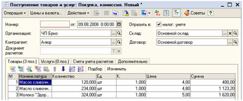 Рисунок 8 Переходим к заполнению табличной части счета. В табличной части есть своя панель инструментов, на которой при помощи кнопки Добавить вносим товары, заказанные нами у поставщика. При добавлении нового товара (услуги) в справочник «Номенклатура» открывается следующая карточка (Рисунок 9):