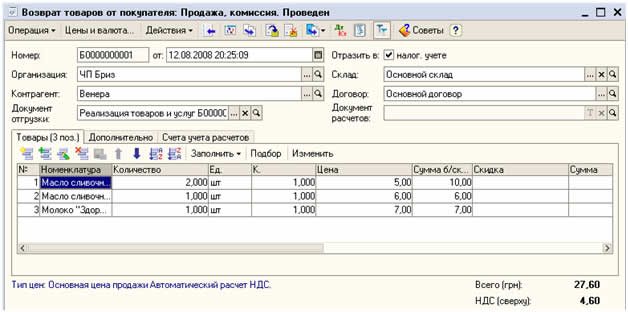Рисунок 10 Вкладка «Услуги» служит для внесения в счет услуг. Во вкладку «Нематериальные активы» можем внести покупаемые НМА. Во вкладке «Дополнительно» можем указать Номер и Дату счета поставщика. После заполнения счета проверяем его по итоговой сумме и сохраняем кнопкой Ок. Для корректировки полученной при покупке налоговой накладной делаем Расчет корректировки (на основании возвратной накладной). Для этого заходим в п.м. Покупка → Возврат товара поставщику → на соответствующей накладной открываем контекстное меню → На основании → Регистрация входящего налогового документа (Рисунок 11).
