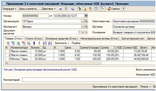 Печатаем документ и проводим его кнопкой Ok. Приложение 2 к налоговой накладной Для корректировки налоговой накладной делаем документ «Приложение 2 к налоговой накладной». Для этого заходим в п.м. Продажа → Налоговая накладная → на соответствующей налоговой накладной открываем контекстное меню → На основании →Приложение 2 к налоговой накладной.