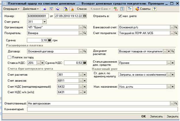 Рисунок 26 Возврат денег Возврат денег мы можем оформить Платежным поручением исходящим, или Платежным ордером на списание денежных средств, или Расходным кассовым ордером. В любом случае эти документы делаем на основании документа «Возврат товаров от покупателя». Для этого заходим в п.м. Продажа → Возврат товаров от покупателя и на соответствующем документе открываем контекстное меню → На основании и выбираем нужный документ. Приведем пример Платежного ордера на списание денежных средств (Рисунок 27):