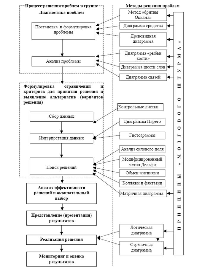 Для каждого этапа процесса решения проблем в группе предлагается использовать один или несколько различных методов. Необходимо заметить, что некоторые из данных методов могут применяться на разных этапах. На рисунке 3 представлена структура соотношений методов и этапов процесса решения проблем в группах..