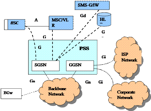 CSS представляет собой традиционную систему SS сети GSM, включающую в себя уже рассмотренные ранее узлы (см. «Описание компонентов сети GSM»). При внедрении GPRS необходима модернизация программного обеспечения MSC, которая позволяет выполнять комбинированные процедуры GSM/GPRS, например, комбинированную процедуру подключения MS (Attach): IMSI/GPRS. Внедрение GPRS не оказывает влияния на GMSC, так как этот центр участвует в установлении соединения к абонентам сети GSM от абонентов сети фиксированной связи PSTN. HLR является базой данных, в которой содержатся все абонентские данные, в том числе данные, относящиеся к абонированию службы GPRS. Таким образом, в HLR хранятся данные как для службы коммутации каналов, так и для службы коммутации пакетов. Эта информация включает в себя, например, разрешение/запрет на использование услуг GPRS абоненту, имя узла доступа (Access Point Name – APN) провайдера службы Интернет (Internet Service Provider – ISP), а также указание на то, выделены ли для MS адреса IP. Эта информация хранится в HLR как контекстное абонирование (context subscription) протокола пакетной передачи данных PDP. В HLR может храниться до 5 контекстов PDP на одного абонента. Доступ к хранящейся в HLR информации осуществляется из SGSN. При роуминге обращение за информацией может осуществляться в HLR, не связанный с собственным узлом SGSN. Для работы HLR в сети GPRS необходима модернизация его программного обеспечения. Служба коротких сообщений – взаимодействующий MSC (SMS-IW-MSC) позволяет MS с функциями GPRS передавать и принимать SMS через радиоканалы GPRS. SMS-IW-MSC не изменяется при внедрении GPRS.