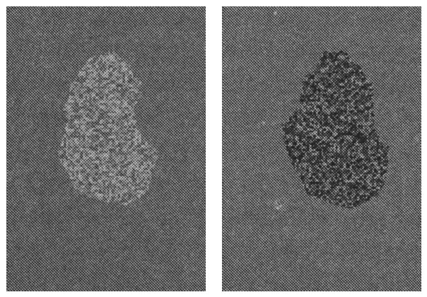 Измерения, используемые для классификации образов, называются признаками. Признак – это некоторое количественное измерение объекта произвольной природы. Совокупность признаков, относящихся к одному образу, называется вектором признаков. Вектора признаков принимают значения в пространстве признаков. В рамках задачи распознавания считается, что каждому образу ставится в соответствие единственное значение вектора признаков и наоборот: каждому значению вектора признаков соответствует единственный образ. Классификатором или решающим правилом называется правило отнесения образа к одному из классов на основании его вектора признаков. Пример 1. Иллюстрация понятий признаков и классификатора и идеи распознавания (классификации). Рассмотрим задачу диагностики печени по результатам инструментального исследования (рис.1.1). Доброкачественные (левый рисунок – класс A) и злокачественные (правый рисунок – класс B) изменения дают разную картину. Предположим, что имеется несколько препаратов в базе данных, про которые известна их принадлежность к классам A и B (правильная классификация). Очевидно, что образцы отличаются интенсивностью точек изображения. В качестве вектора признаков выберем пару: среднее значение (