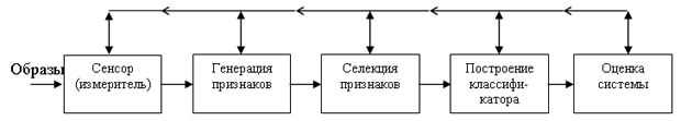 На рис.1.2 представлены изображения этих образов в пространстве признаков. Точки, соответствующие прецедентам разных классов, разделяются прямой линией. Классификация неизвестного образа (соответствующая точка изображена звездочкой) состоит в проверке положения точки относительно этой разделяющей прямой. Практическая разработка системы классификации осуществляется по следующей схеме (рис.1.3). В процессе разработки необходимо решить следующие вопросы.