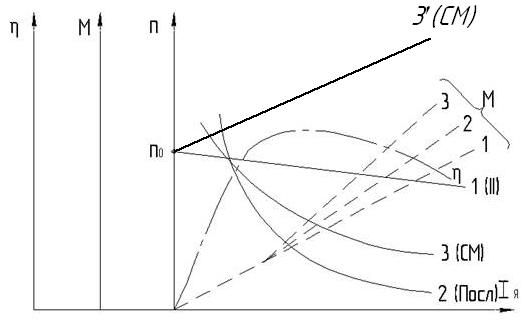 Рис.8.13 Рабочие характеристики двигателей постоянного тока: 1 – с параллельным возбуждением; 2 – с последовательным возбуждением; 3 – со смешанным возбуждением; ___ - скоростные характеристики