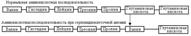 Рисунок. Первые семь аминокислот в b - цепи гемоглобина человека. b - цепь состоит из 146 аминокислот. Замена глутаминовой кислоты валином в шестом положении ответственна за тяжелое наследственное заболевание – серповидноклеточную анемию.
