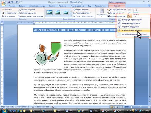 Для поворота рисунка на 90 градусов в ту или иную сторону, а также для отражения рисунка можно воспользоваться вкладкой Формат.