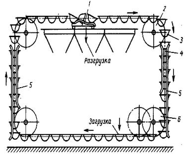 Рис. 14.3.Схема ковшового конвейера: 1 - тяговая цепь; 2 - ковши; 3 - направляющие; 4 - приводная звёздочка; 5 - натяжная звёздочка; 6 - разгрузочное устройство Металлическая конструкция конвейера может быть открытой или закрытой в герметичный кожух (газирующие или токсичные грузы). Ковшовые конвейеры применяют для транспортирования сухих, пылевидных, зернистых и кусковых грузов на предприятиях химической и угольной промышленности, на топливоподачах электростанций, цементных заводах и др. Производительность 10-500 т/ч, длина горизонтальных участков до 150 м, высота подъёма до 60 м. Достоинства (кроме указанных ранее): - отсутствие истирания и крошения груза; - возможность транспортирования разных грузов. Недостатки: - сложность конструкции и эксплуатации (большое число шарниров и катков); - большая масса ходовой части; - возможность раскачивания и ударов ковшей друг о друга при повышенной скорости (более 0,4 м/с).