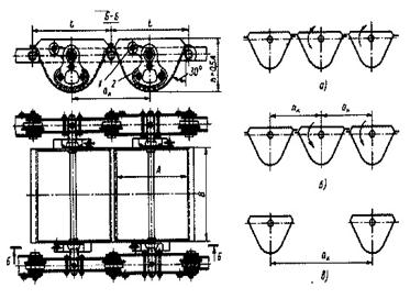 3.2. Элементы конвейеров (рис. 14.4) Тяговый элемент - две пластинчатые катковые цепи с шагом 315-1000 мм, катки ребордные. Ковши - сварные из листовой стали толщиной 2-6 мм, подвешивают их на сплошных или консольных осях к пластинам цепи. При полуосях лучше разгрузка и загрузка ковшей. Ковши могут быть расположены на цепи: 1)сомкнуто - почти вплотную друг к другу - зазоры между ковшами перекрываются козырьками, загрузка может быть непрерывной; 2)расставлено - загрузка порционная (питатель). Чаще первый тип расположения ковшей, хотя требуются устройства для переориентирования козырьков. Расставленные ковши применяются при грузах большой кусковатости и небольшой производительности. Разгрузка ковшей на верхнем горизонтальном участке путём опрокидывания при помощи разгрузочных шин передвижных или стационарных с дистанционным или автоматическим управлением. Для опрокидывания ковши имеют кривошипные упоры или консольные ролики.