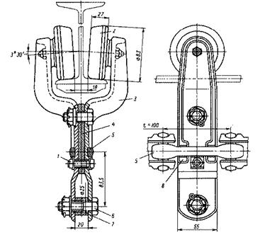 1. Тяговый элемент - чаще всего цепь различных типов, реже стальной канат. Для конвейеров, расположенных в горизонтальной плоскости применяют пластинчатые тяговые и приводные цепи, для пространственных - двухшарнирные цепи (для лёгких конвейеров), горячештампованные разборные (для конвейеров среднего и тяжёлого типов). Для лёгких конвейеров иногда применяют круглозвенные цепи, изредка секционные цепи. 2. Каретки (рис. 15.3). Каретки состоят из двух катков (2) с консольными осями и подшипниками, кронштейнов (3) и прокладок (4). Кронштейны соединяются друг с другом болтами (1) после установки во внутреннее звено (5) разборной цепи. Болт (6) с распорной трубкой (7) служит для шарнирного крепления грузовой подвески. Каретки бывают: - рабочие - грузовые (одинарные и траверсные); - вспомогательные - опорные (поддерживающие). Вспомогательные каретки устанавливают между рабочими для предупреждения провисания тяговой цепи. Цепь может иметь жёсткое или шарнирное крепление к каретке. Катки кареток - безребордные. Профиль обода катка зависит от профиля пути. В настоящее время применяют катки-подшипники со сфероконическим ободом. Тип и размер подшипника катка выбирают по расчётной нагрузке и температуре окружающей среды. Для конвейеров лёгкого типа иногда применяют катки из поликапролактама и др.