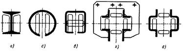 Рис. 15.5. Схемы подвесного пути Двубалочные пути (г, д) выполняют из двух прокатных или гнутых уголков или двух специальных гнутых профилей. Путь из двутавровых балок имеет наибольшее распространение для конвейеров среднего и тяжёлого типов. Его преимущества - простота изготовления, монтажа и крепления, жёсткость пути и возможность использования верхних полок в качестве контршин. Пути из уголков и фасонных гнутых профилей применяют для конвейеров среднего и лёгкого типов с двухшарнирными и круглозвенными цепями. Их преимущества - возможность использования кареток с цилиндрическими катками, малая масса, возможность выполнения вертикальных перегибов с малым радиусом. Недостатки - малая жёсткость, повышенная трудоёмкость монтажа, креплений и установки контршин.