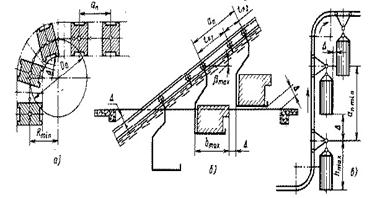 где amin – минимальный шаг, обеспечивающий свободную проходимость грузов наибольшей длины Вmax на горизонтальных поворотах наименьшего радиуса Rmin и на вертикальных перегибах с наибольшим углом наклона bmax.