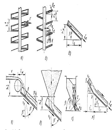 Рис.22.2. Схемы к расчету спускных устройств: а – винтовая поверхность с вертикальным бортом; б – то же с наклонной образующей; в – схема спускного устройства; г – схема определения угла поворота струи груза; д – схема определения высоты свободного падения частицы груза; е – схема определения скорости истечения наклонной струи; ж – составной желоб