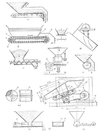 Рис. 24.4. Питатели: а – ленточный; б – пластинчатый; в – цепной; г –винтовой; д – тарельчатый; е – барабанный; ж – лопастной; з – вибрационный; и – плунжерный; к – маятниковый