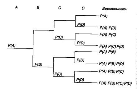 Для анализа отказов и разработки мероприятий по их устранению часто весьма эффективным методом является построение дерева отказов. Дерево отказов представляет собой логическую диаграмму, состоящую из блоков двух типов — событий и логических символов. Событие верхнего уровня — анализируемый отказ объекта; на втором уровне указываются события — возможные причины отказа объекта. Далее анализируются события более низкого уровня путем анализа каждой возможной причины. Для связи между событиями используются логические символы «и» или «или». Символ «и» применяется в том случае, когда выходное событие происходит тогда и только тогда, когда произошли все входящие события. Символ «или» используется тогда, когда для осуществления выходного события должно произойти хотя бы одно из входных. Построение дерева заканчивается после выявления причин отказов, не требующих дальнейшего анализа, например таких, как выход из строя предохранителя или отказ оператора и т.п. На рис..1 показан упрощенный пример построения дерева отказов. Рассматриваются причины остановки насоса. Установлено, что отказ произошел по одной из трех причин (сим«или»): из-за отключения электропитания, неисправности выключателя или отказа двигателя. Отказ двигателя в свою очередь связан или с перегоранием предохранителя, или с неисправностью обмотки. Неисправность обмотки возникла вследствие нарушений условий эксплуатации двигателя и ошибки оператора (символ «и»): предполагается, что в данной ситуации при правильном поведении оператора нарушение условий эксплуатации не привело бы к выходу из строя обмотки. Иногда возможна и количественная оценка вероятности отказа для события верхнего уровня, если можно, например, по данным статистики, оценить вероятности событий нижнего уровня. Другим полезным инструментом для анализа последствий отказа является дерево событий. В основе дерева событий (рис. 7.2) — некоторое исходное событие, например, отказ элемента с известной вероятностью Р(А). Ветви дерева показывают возможные последствия этого отказа.