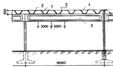 1 – круглые световые проемы; 2 – сборная панель – складка пролетом 18м.; 3 – стропильная железобетонная балка.