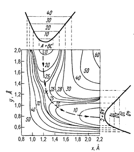 Рассмотрим взаимодействие атома А с двухатомной молекулой ВС. В ходе реакции А + ВС ® АВ + С (5) расстояние между атомами А и В уменьшается, а между атомами В и С увеличивается. Если построить график зависимости потенциальной энергии системы от расстояний у и х между атомами А-В и В-С соответственно, то получим некоторую поверхность, называемую поверхностью потенциальной энергии. Сечения поверхности потенциальной энергии представлены на рис. 1. Сплошные линии соединяют точки, отвечающие одному и тому же значению энергии (они аналогичны горизонталям на географической карте, указывающим высоту над уровнем моря). Каждому фиксированному расстоянию у между А и В могут соответствовать различные величины расстояний х между В и С. Среди них есть одно, соответствующее минимуму потенциальной энергии х min. Наиболее выгодный (с точки зрения затрат энергии) путь перехода от исходной системы к конечной проходит по линии, соединяющей точки, соответствующие минимуму потенциальной энергии. Проекция этой линии показана пунктиром на рис. 1. Путь вдоль нее называют координатой реакции. Зависимость потенциальной энергии реагирующих частиц от координаты реакции имеет вид кривой с максимумом, аналогичной кривой, показанной на рис. 2.