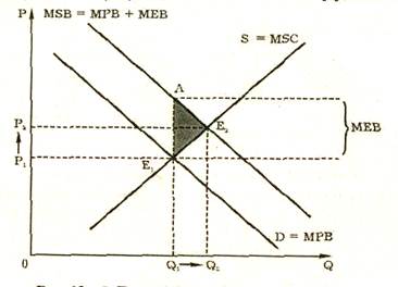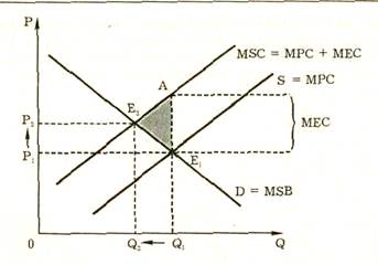 Интернализация внешних эффектов. Положительные внешние эффекты и их графическая интерпретация. Отрицательные внешние эффекты и их графическая интерпретация. Понятие внешних эффектов. Внешние эффекты (экстерналии) – это издержки или выгоды от рыночных сделок, не получившие отражения в ценах. Они называются "внешними", так как касаются не только участвующих в данной операции экономических агентов, но и третьих лиц. Возникают они в результате как производства, так и потребления товаров и услуг. Внешние эффекты делятся на отрицательные и положительные. Отрицательные эффекты связаны с издержками, положительные — с выгодами для третьих лиц. Таким образом, внешние эффекты показывают разность между социальными издержками (выгодами) и частными издержками (выгодами). Для упрощения дальнейшего изложения введем обозначения: MSC — предельные общественные (социальные) издержки (marginal social cost); MРC— предельные частные издержки (marginal private cost); МЕС—предельные внешние издержки (marginal external cost). MSB — предельные общественные (социальные) выгоды (marginal social benefit); МРВ— предельные частные выгоды (marginal private benefit); МЕВ—предельные внешние выгоды (marginal external benefit).