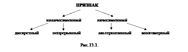 Пусть требуется изучить определенную совокупность объектов относительно некоторого признака. Для получения опытных данных необходимо провести обследование соответствующих объектов. Однако иногда обследование может быть затруднено в связи с большим объемом исследуемой совокупности объектов. В некоторых случаях обследование объектов всей совокупности практически не имеет смысла, поскольку они разрушаются в результате обследования. Пример 13.1. При проверке качества производства лампочек последние должны находиться под напряжением довольно большое время, что, естественно, невозможно в условиях массового производства. Поэтому для проверки на стандартность подвергают контролю только небольшую часть изготовленных лампочек. Определение 13.1. Совокупность всех мысленно возможных объектов данного вида, над которыми производятся наблюдения с целью получения конкретных значений определенной случайной величины, или совокупность результатов всех мыслимых наблюдений, производимых в неизменных условиях над одной из случайных величин, связанных с данным видом объектов, называется генеральной совокупностью (ГС). Генеральную совокупность будем называть конечной или бесконечной в зависимости от того, конечна или бесконечна совокупность составляющих ее элементов. Определение 13.2. Часть отобранных объектов из ГС (результаты наблюдений над ограниченным числом объектов из этой совокупности) называется выборочной совокупностью (ВС) или выборкой. Число Однако не всякая выборка может быть действительным представлением о генеральной совокупности. Пример 13.2. В цехе по производству специальных втулок на токарных станках работают квалифицированные и только начинающие токари. Для проверки качества продукции на контроль взята партия втулок. Если эти втулки изготовлены квалифицированным токарем, то, очевидно, представление о качестве всей продукции цеха будет «завышенным», а если втулки изготовлены начинающим токарем, то это представление будет «заниженным». Для того чтобы по выборке можно было достаточно уверенно судить о генеральной совокупности, выборка должна быть представительной (репрезентативной). Репрезентативность выборки обеспечивается случайностью отбора. Последнее означает, что любой объект выборки отобран случайно, при этом все объекты имеют одинаковую вероятность попасть в выборку. Для выборки из конечной совокупности на практике более часто используется выбор без возвращения (бесповторная выборка), когда каждый отобранный объект перед выбором следующих объектов в исследуемую совокупность не включается (для определения выигрышных лотерейных билетов, при статистическом контроле качества, при демографических исследованиях). Выборка с повторением рассматривается обычно лишь в теоретических исследованиях (регистрация числа частиц, коснувшихся в течение данного времени стенок сосуда, внутри которого совершается броуновское движение). Если В случае, когда объем ГС небольшой, или когда основной задачей наблюдения является полный учет всех элементов, принимают сплошное наблюдение (перепись страны). Основой проведения наблюдений и формирования выборочной совокупности является интересующий исследователя группировочный признак или признаки. Схематичная классификация признаков приведена на рисунке 13.1