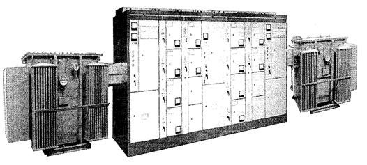 Размещение внутрицеховых подстанций в помещениях пыльных и с химически активной средой допускается при условии принятия мер, обеспечивающих надежную работу электрооборудования. В производственных помещениях трансформаторы и РУ могут устанавливаться открыто, в камерах и отдельных помещениях. На каждой открыто установленной цеховой подстанции и КТП могут быть применены масляные трансформаторы мощность до 1600 кВА. Расстояние в свету между масляными трансформаторами должно быть не менее 10 м. Для внутрицеховых подстанций и КТП с сухими трансформаторами или негорючим диэлектриком их мощность и расстояние между ними не ограничиваются. КРУ и КТП следует, как правило, размещать в пределах «мертвой зоны» подъемно-транспортных механизмов. В цехах с интенсивным движением внутризаводского транспорта КРУ и КТП следует ограждать. Ширина прохода для управления и ремонта КРУ выкатного типа и КТП должна обеспечивать удобство обслуживания и ремонта (0,6÷0,8 м). Ввод от трансформатора на щит может быть выполнен двумя способами: кабелями снизу на вводных панелях, предназначенных для кабельных вводов; шинами сверху с помощью вводных панелей или же непосредственно к сборным шинам через разъединитель, установленный на стене. На рисунке 11.15 представлена комплектная двухтрансформаторная подстанция мощностью 630÷1000 кВА для внутренней установки с однорядным расположением оборудования. Автоматические выключатели выдвижного исполнения служат защитно-коммутационной аппаратурой, каждый автомат закрыт дверью, управление производится рукоятками и ключами, расположенными на дверях шкафов, а для дистанционного управления концы проводов подведены к рейке с зажимами. Присоединение вводов высшего напряжения глухое.