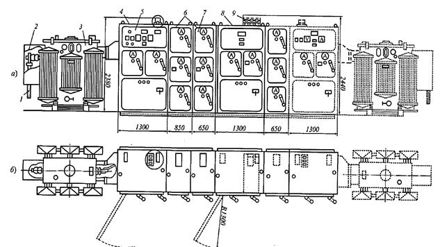 а - вид спереди; б - план; 1 - кабель ВН; 2 - шкаф ввода ВН; 3 - силовой трансформатор; 4 – шкаф ввода НН; 5 - отсек приборов; 6 - шкаф отходящих линий НН; 7 - секционный шкаф НН или шкаф отходящих линий; 8 - шинный короб; 9 - окно для вывода кабеля вверх