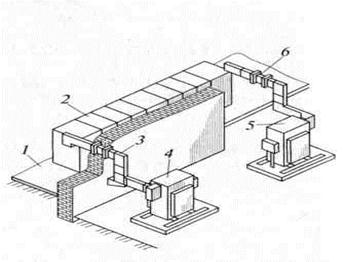 1 – трансформатор 1000 кВА; 2 – шкаф ввода 6÷10 кВ; 3 – РУНН; 4 – помещение для конденсаторов; 5 – кабель 6÷10 кВ в трубе; 6 – РП 6÷10 кВ