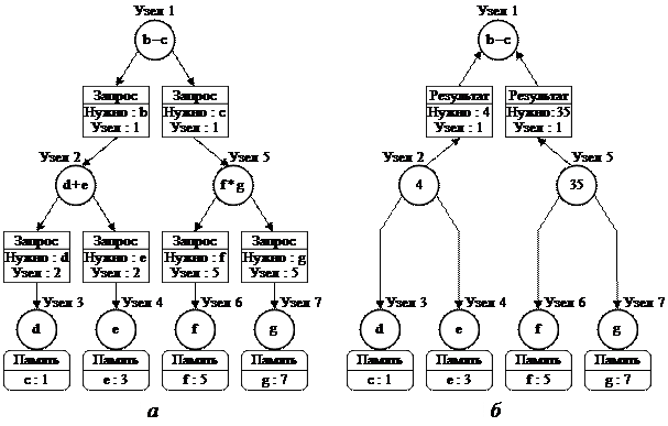 Рис. 14.16. Пример вычисления выражения на редукционной ВС: а – исходное положение; б – после первого шага редукции